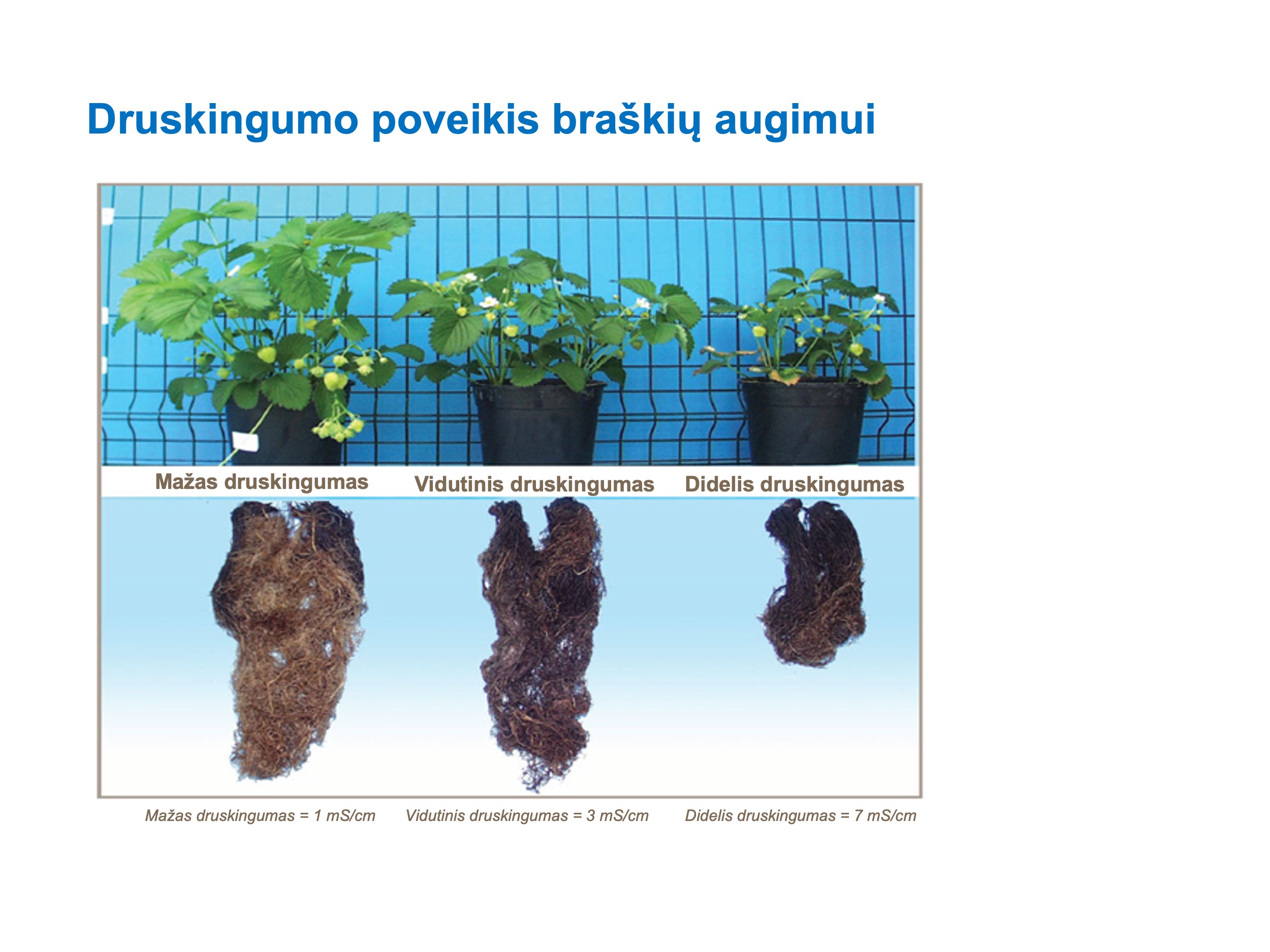 Druskingumo lygis šaknų zonoje yra tiesiogiai susijęs su vandens kokybe, tręšimo dažniu ir drėkinimo gyliu.