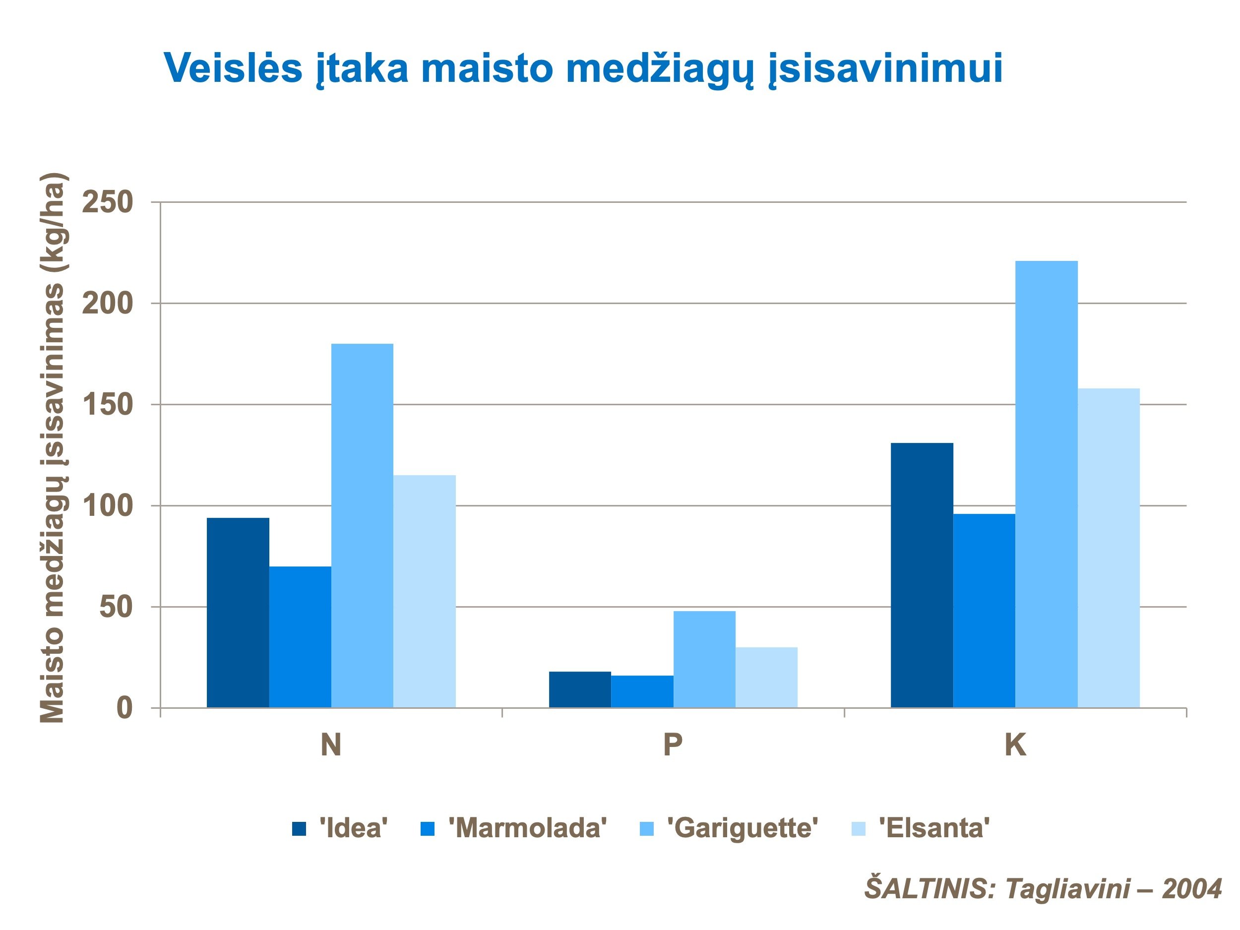 Taip pat svarbu suderinti maisto medžiagų poreikius, atsižvelgiant į turimą auginimo sistemą ir derliaus lūkesčius, kadangi įvairios veislės labai skiriasi. Ši diagrama rodo, kad kai kurioms veislėms gali reikėti dvigubai daugiau azoto (N), fosforo (P) ir kalio (K) nei kitoms.