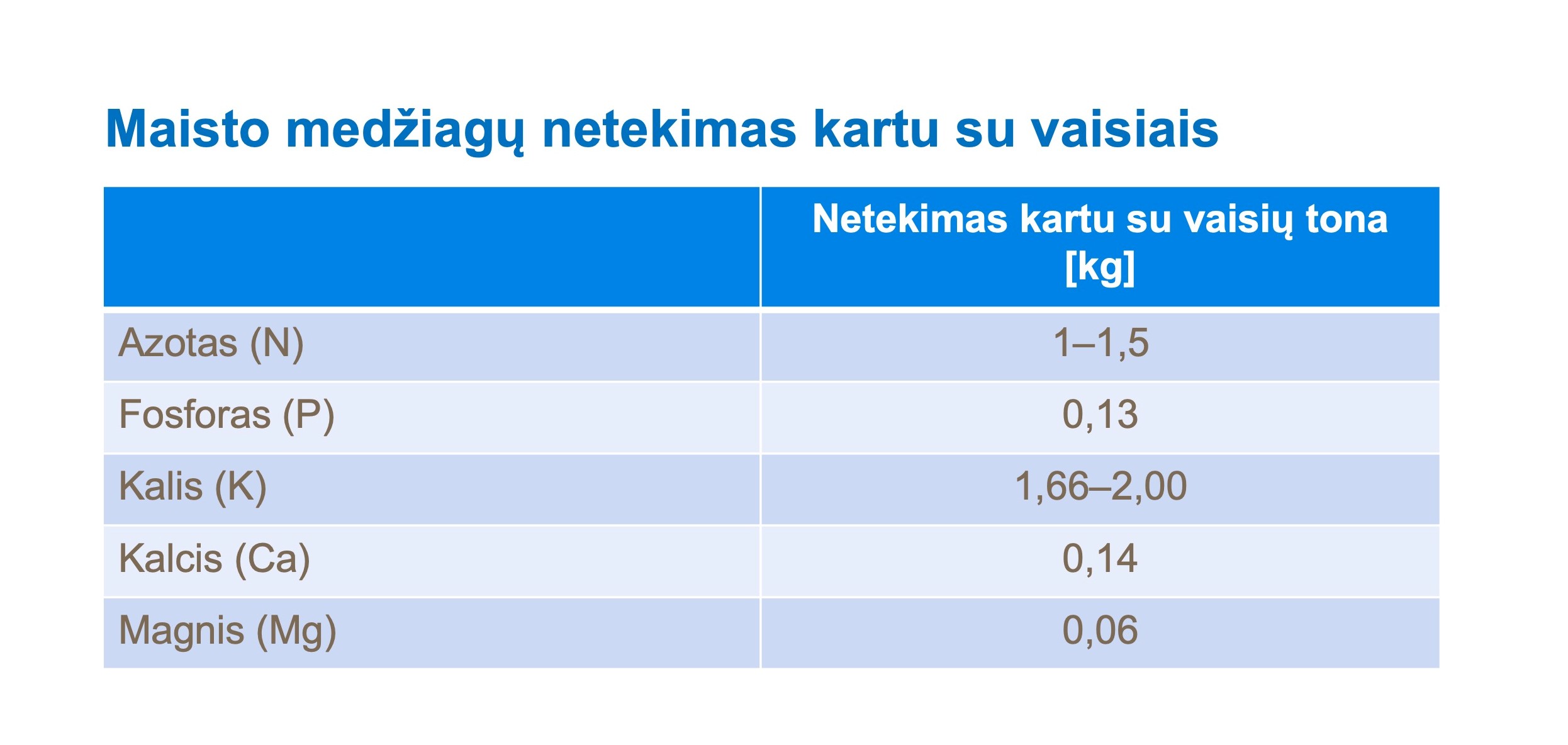 Tai pat reikia didelių kalcio kiekių. Įprastai kiekvienai vaisių tonai reikia apie 1,5 kg kalcio. Daug kalcio yra randama šaknyse, augalų lapuose ir lapkočiuose. Kalcio patekimas į vaisius yra ribotas daugiausia dėl to, kad kalcis yra įsisavinamas kartu su vandeniu ir tik per vandenį garinančius organus, taip parodydamas augalo įsisavinto vandens kiekį. Todėl, siekiant išlaikyti vaisių kokybę, o ypač jų tvirtumą ir laikymo terminą nuskynus, vaisiams būtina viso sezono metu reguliariai tiekti kalcį.