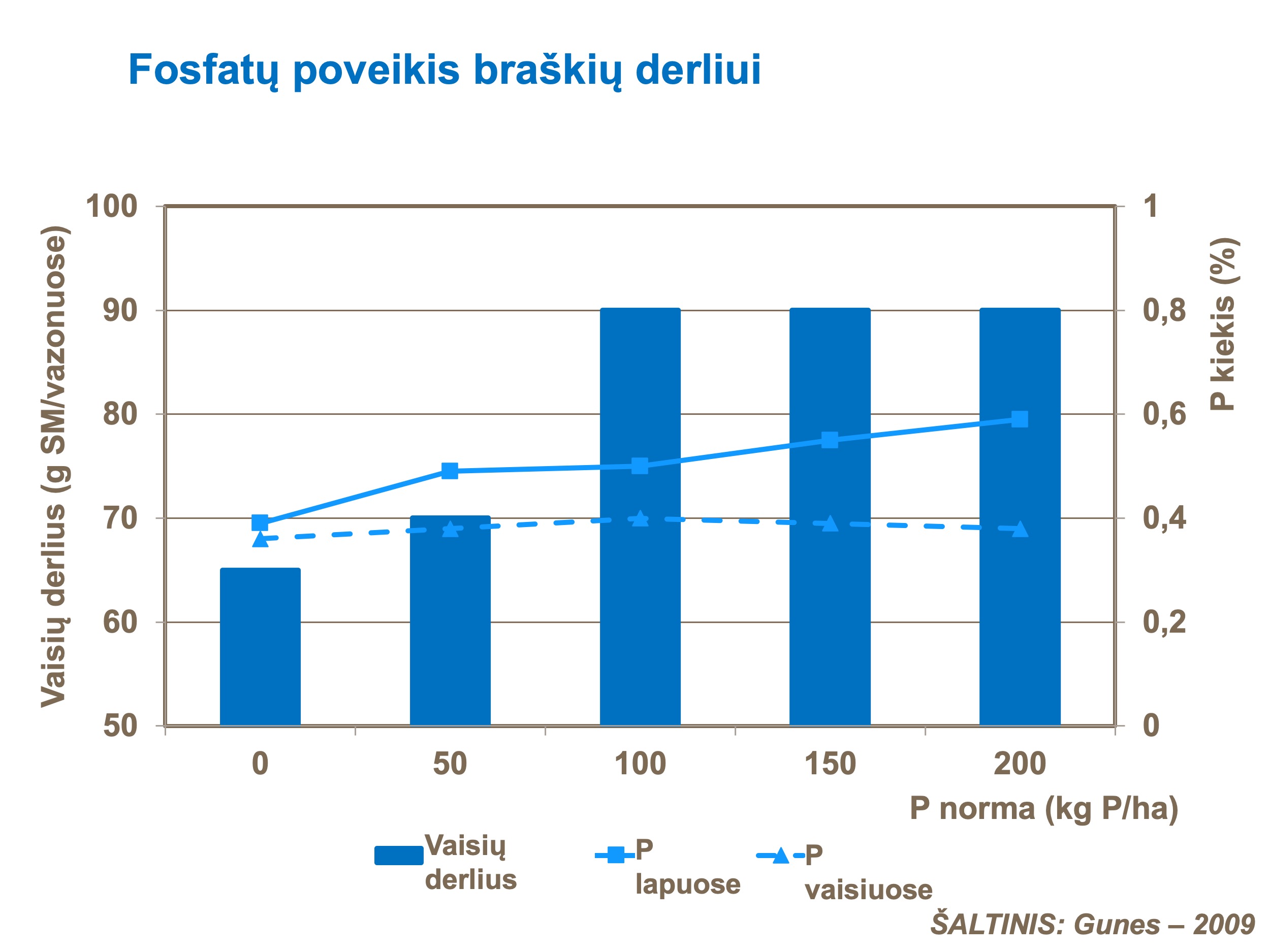 Reikiamas fosforo kiekis yra palyginti mažas, tačiau, jeigu jo trūkumas pasireiškia vykstant žiedinių pumpurų diferenciacijai, uogų pumpurų skaičius sumažėja ir krenta derlingumas.