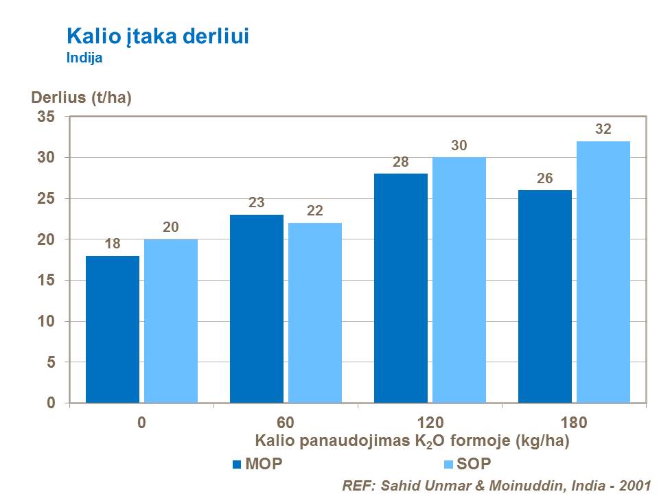 Šie Indijoje atlikti tyrimai rodo derliaus padidėjimą, patręšus kalio trąšomis, o taip pat, kalio sulfato (SOP) pranašumą kalio chlorido (MOP) atžvilgiu.