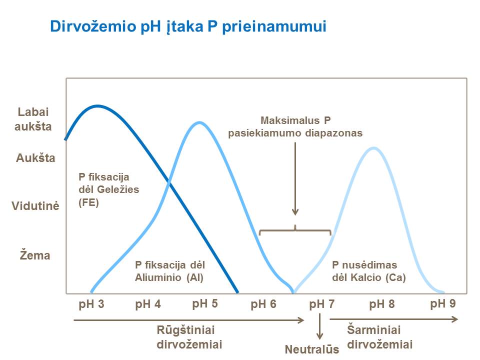 Šioje schemoje pavaizduota dirvožemio pH įtaka fosforo ištekliams dirvoje dėl kalcio nusėdimo, esant dideliam pH ir dėl to, kad geležis ir aliuminis sulaiko fosforą, kai pH mažas.