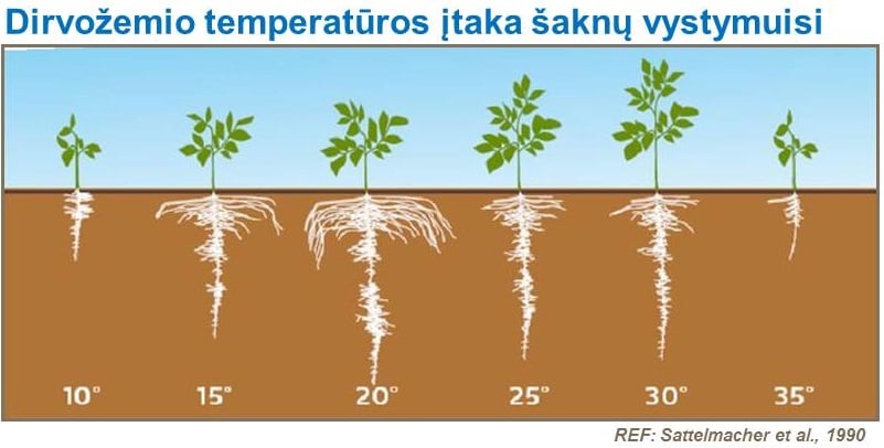 Nors šaknys pradeda augti, kai dirvos temperatūra būna tarp 10 - 35°C, geriausiai šaknys vystosi, kai vyraujanti dirvožemio temperatūra yra tarp 15 - 20°C. (žr. iliustraciją).