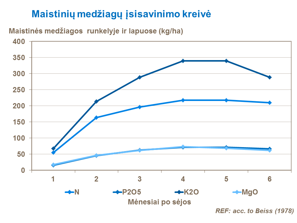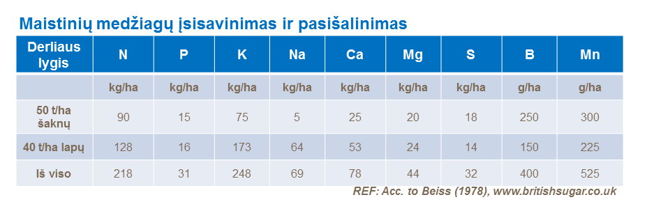Didžiausias maisto medžiagų poreikis pasėliams pasireiškia praėjus maždaug trims – keturiems mėnesiams po sėjos. Žemiau pateiktoje lentelėje matome, kad fosforo (P) ir magnio (Mg) įsisavinimas vyksta ypatingai lėtai, kadangi jaunų cukrinių runkelių šaknų pajėgumas ekstrahuoti maisto medžiagas yra labai menkas. Todėl ypatingai svarbu tręšti atitinkamai paruoštą dirvožemį vandenyje tirpaus fosforo (P) trąšomis.