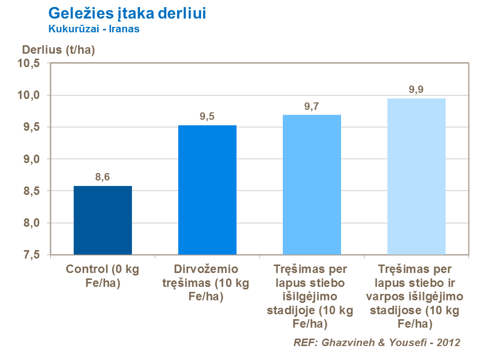 Geležies trūkumui kukurūzų pasėliai yra mažiau jautrūs. Jei pasireiškia geležies trūkumas, praktiniai bandymai parodė, kad patręšus lapų trąšomis, ypač vėlėsnėje lapų vystymosi fazėje ir pradėjus ilgėti stiebui – pdidėja pasėlių derlingumas.