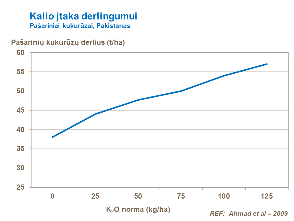 Bandymai patvirtina, kad kukurūzų pasėliai labai teigiamai sureaguoja, kai tręšiami didelėmis kalio trąšų normomis. Daugelyje šalių metinės kukurūzų pasėlių tręšimo normos kalio trąšomis svyruoja nuo 150 iki 250 kg K2O/ha. Siekiant padidinti kukurūzų pasėlių derlingumą, poreikiai kalio ir azoto trąšoms yra labai panašūs, o patręšus per mažomis azoto normomis, pablogėja kalio (K) įsisavinimas, sutrinka augalų augimas ir vystymasis. Kai kukurūzų pasėliams trūksta kalio ir fosforo, burbuolės viršūnė nepilnai užsipildo sėklomis.