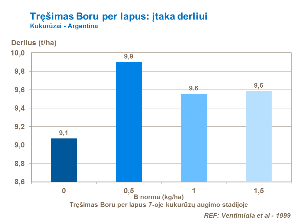 Boras dalyvauja ląstelių dalijimosi procese, skatina apvaisinimo vamzdelio susiformavimą ir augimą, todėl taip pat yra tiesiogiai susijęs su grūdų užsimezgimo ir grūdų pildymosi burbuolėje procesais. Kai pasėliams trūksta boro, grūdų užsimezgimo ir pildymosi procesas būna nepilnavertis, burbuolėje lieka daug tuščių grūdų lizdelių, grūdai paprastai būna smulkūs, - tik vienas - kitas stambus grūdas visoje burbuolėje. Kukurūzų pasėlių derlingumas gali žymiai pdidėti, o derliaus kokybė pagerėti, patręšus boro trąšomis dirvožemį ar lapų trąšomis su boru augalo stiebo - koto ilgėjimo tarpsnyje (nuo V5 iki V7 organogenezės etapo).