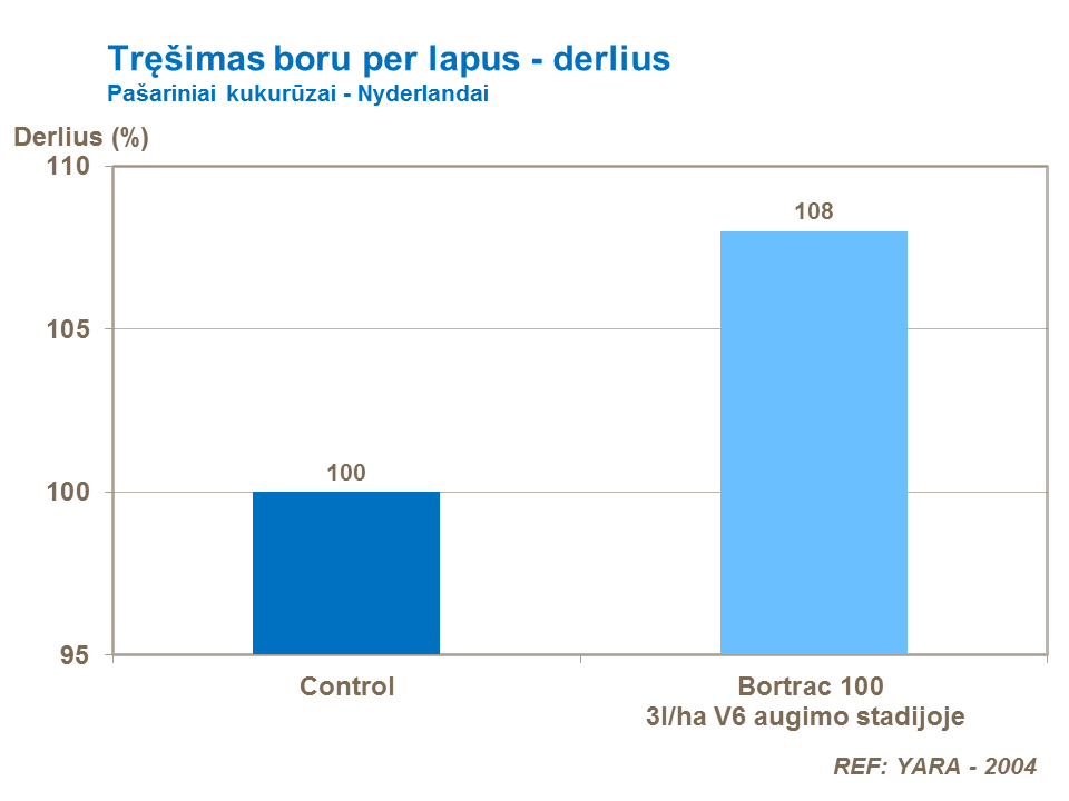 Yra bandymais patvirtintų įrodymų, kad tręšiant kukurūzų pasėlius boru, padidėja pašarinių kukurūzų derlius ir krakmolo kiekis žaliojoje masėje. Jei trūksta boro, patręšus pašarinių kukurūzų pasėlius lapų trąšomis su boru V5 ar V6 organogenezės etapuose, kai jau susiformavusi vešli lapija, padidėja pašarinių kukurūzų derlingumas.
