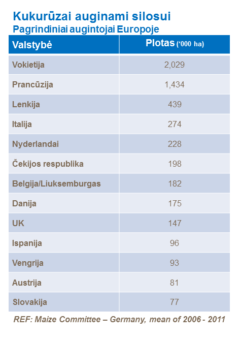 Kiekvienais metais, 27-se ES šalyse pašarinių, silosuojamų kukurūzų pasėliai auginami maždaug 5 milijonuose ha, ir panašūs plotai skiriami grūdiniams kukurūzams. Vokietija ir Prancūzija yra pagrindinės pašarinių kukurūzų augintojos.