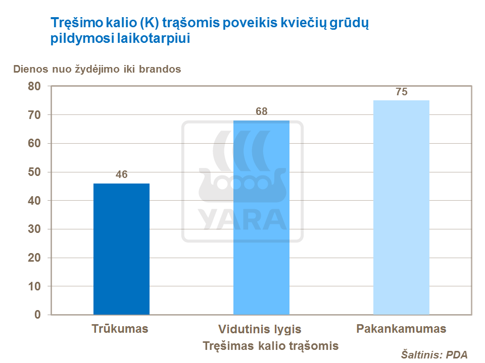 Kalis paskirsto mitybos elementus augalų audiniuose, reguliuodamas transpiracijos srautus mineralų pernešimui į varpą, todėl būtina užtikrinti pakankamas kalio atsargas augaluose. Be to, kalis neleidžia augalams per anksti išglebti grūdų brandos tarpsniu, o tai ypatingai svarbu tuose regionuose, kuriuose vyrauja sausos oro sąlygos. Esant kalio trūkumui, augalai prastai kontroliuoja transpiraciją per lapus, dėl to jie perkaista ir išglemba. Esant pakankamoms kalio atsargoms augalų audiniuose, grūdų brendimo fazė trunka ilgiau, dėl to padidėja grūdų svoris.