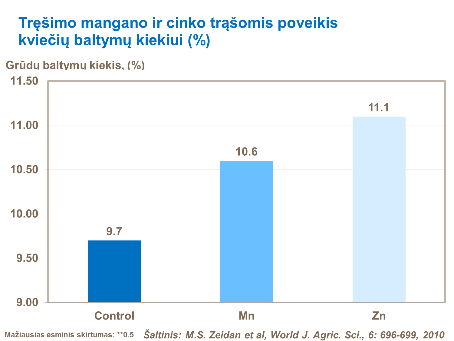Manganas ir cinkas vaidina svarbų vaidmenį augalų metabolizmo procesuose, įskaitant azoto metabolizmą. Geresnis azoto metabolizmas padidina azoto, dalyvaujančio baltymų sintezėje, kiekį.