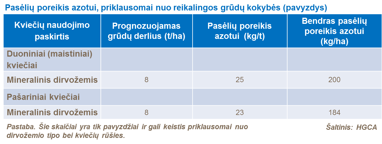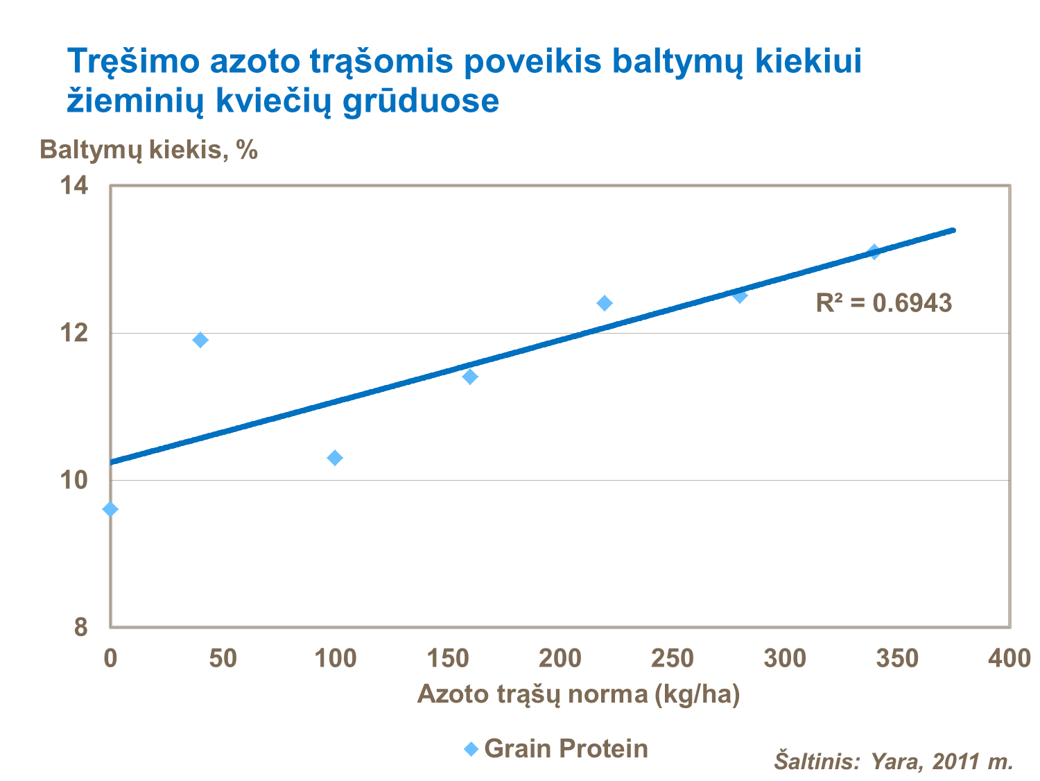 Grūdų baltymų kiekis pašariniuose kviečiuose, esant optimaliam tręšimui N trąšomis, paprastai sudaro apie 11% (tolygu 1,9% N). Duoniniai kviečiai rodo optimalius derliaus rezultatus, kur baltymų kiekis yra apie 12%, todėl, norint pasiekti rinkos rodiklį, viršijantį 13%, dažnai reikia papildomai tręšti azoto trąšomis. Mažas baltymų kiekis grūduose, t.y. mažesnis nei 10% pašarinių kviečių rūšyse, rodo mažesnį už optimalų azoto naudojimą. Svarbus yra ir tręšimo azoto trąšomis laikas. Tręšimas azotu ankstyvoje fazėje (25-32 fazės pagal Zadoksą) paprastai užtikrina didesnį derlingumą, o norint padidinti baltymų kiekį grūduose, azoto trąšas reikia naudoti tarp 37 ir 59 fazės pagal Zadokso skalę. Esant nepakankamam azoto atsargų kiekiui lapų audiniuose, galima imtis korekcinių veiksmų žydėjimo fazėje (70 fazė pagal Zadoksą), tręšiant augalus azoto trąšomis per lapus.