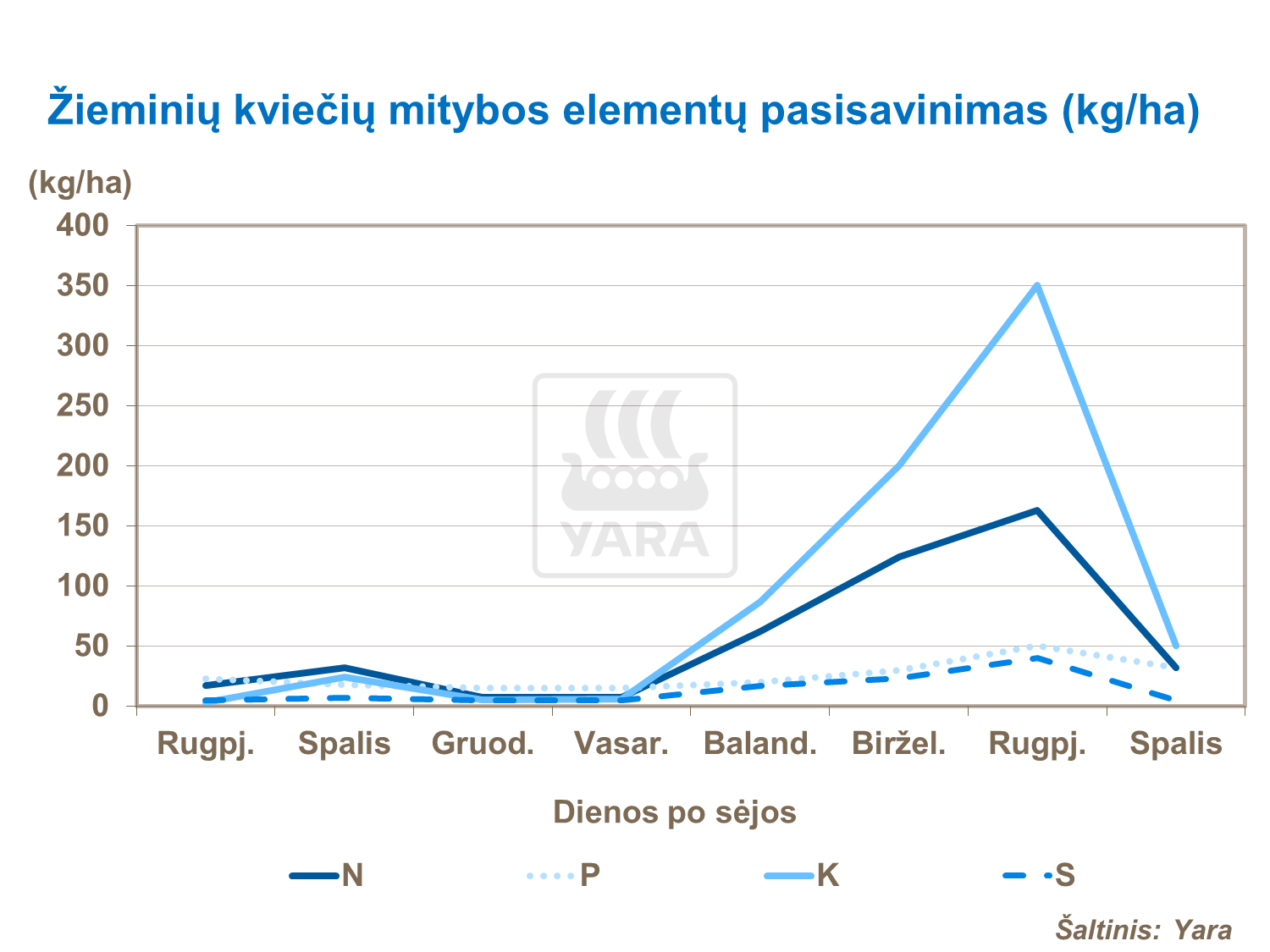 Pavasarį, praėjus 6-7 mėnesiams po sėjos, prasideda kviečių aktyvaus augimo fazė ir, augant biomasei, didėja kasdieninis mitybos elementų poreikis. Tuo laikotarpiu labiausiai reikalingi šie pagrindiniai mitybos elementai: azotas, kalis, fosfatas ir siera, todėl rekomenduojama pasėlius tręšti ne vieną kartą, atsižvelgiant į poreikius. Dėl padidėjusių kviečių augimo ir vystymosi tempų, tręšimo mikroelementais normas taip pat reikia padidinti, siekiant išvengti mikroelementų trūkumo. Šiuo tikslu yra rekomenduojamas tręšimas per lapus (YaraVita produkcija). Be to, tuo augimo laikotarpiu reikia kontroliuoti mangano, cinko, vario ir magnio kiekius.