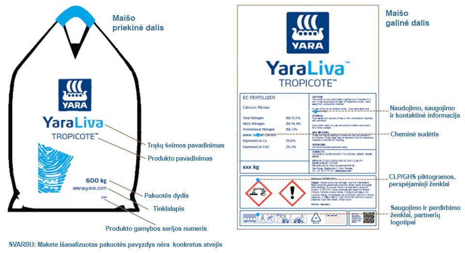 Ant produkto pakuotės visada būna užrašyta produkto kilmė. Ir didmaišių ir mažųjų trąšų įpakavimo maišų priešakinė pusė ženklinama prekių vežimo (gabenimo) etikete, - etikete pagal TDG reglamentą. Ir didmaišių ir mažųjų trąšų įpakavimo maišų nugarinė pusėpaprastai ženklinama ir pagal CLP ir pagal TDG reglamentą. Mes ženkliname konsoliduota etikete, išskyrus, kai: