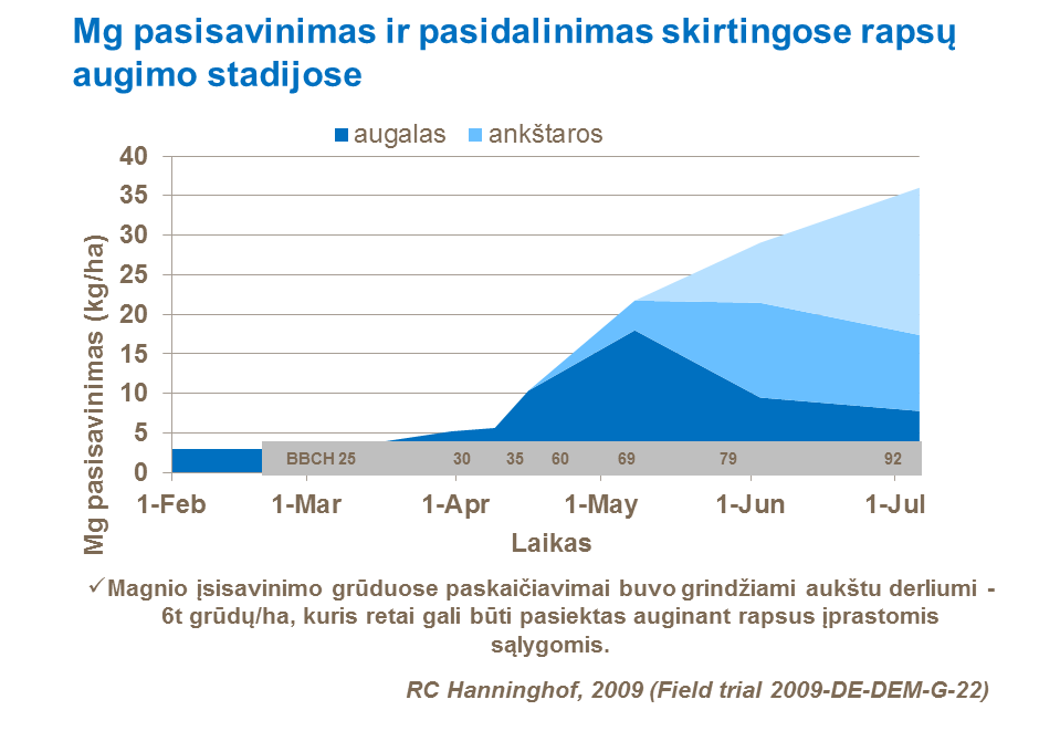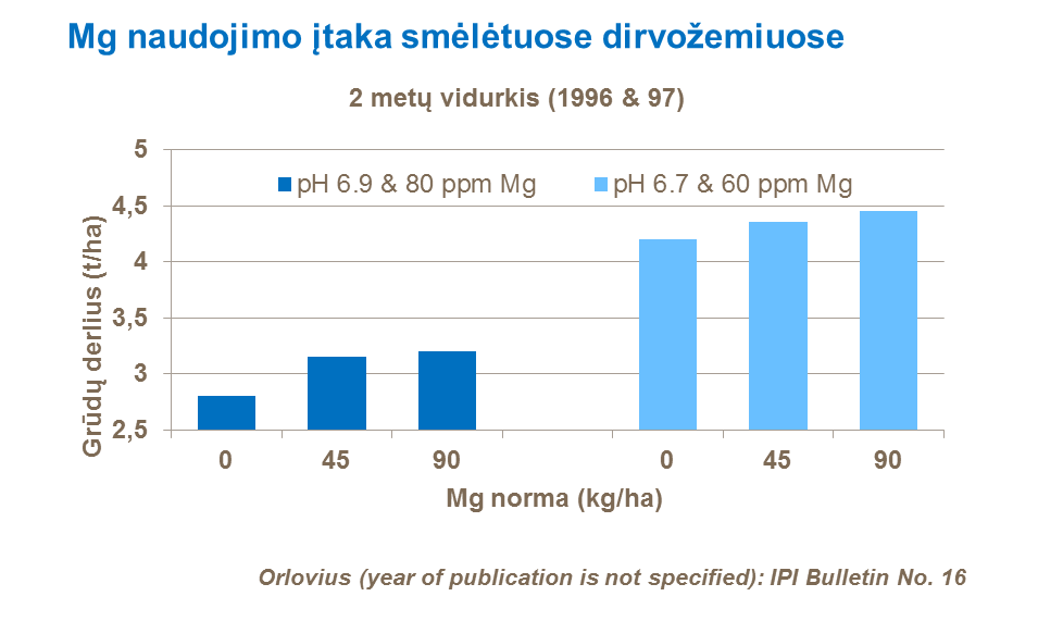 Svarbu, kad didžiausio augalų poreikio magniui laikotarpiu pasėliai turėtų jo pakankamai. Tačiau dėl maistinių elementų tarpusavio sąveikos, pavyzdžiui, šiuo atveju su kaliu, magnio kiekis gali būti nepakankamas. Kadangi trumpas didžiausio magnio poreikio pasėliams laikotarpis, gali prireikti pasėlius tręšti papildomai, naudojant birias trąšas arba tręšti per lapus lapų trąšomis.