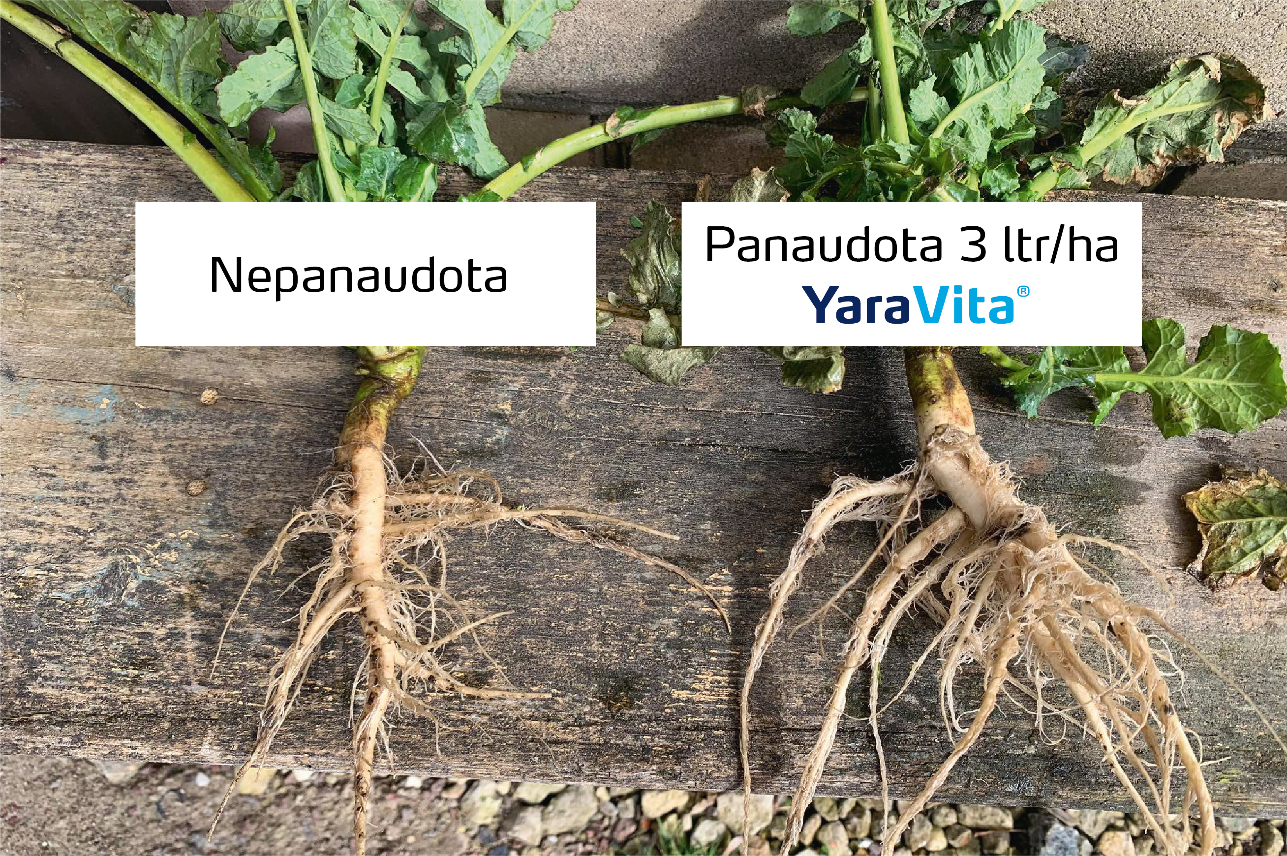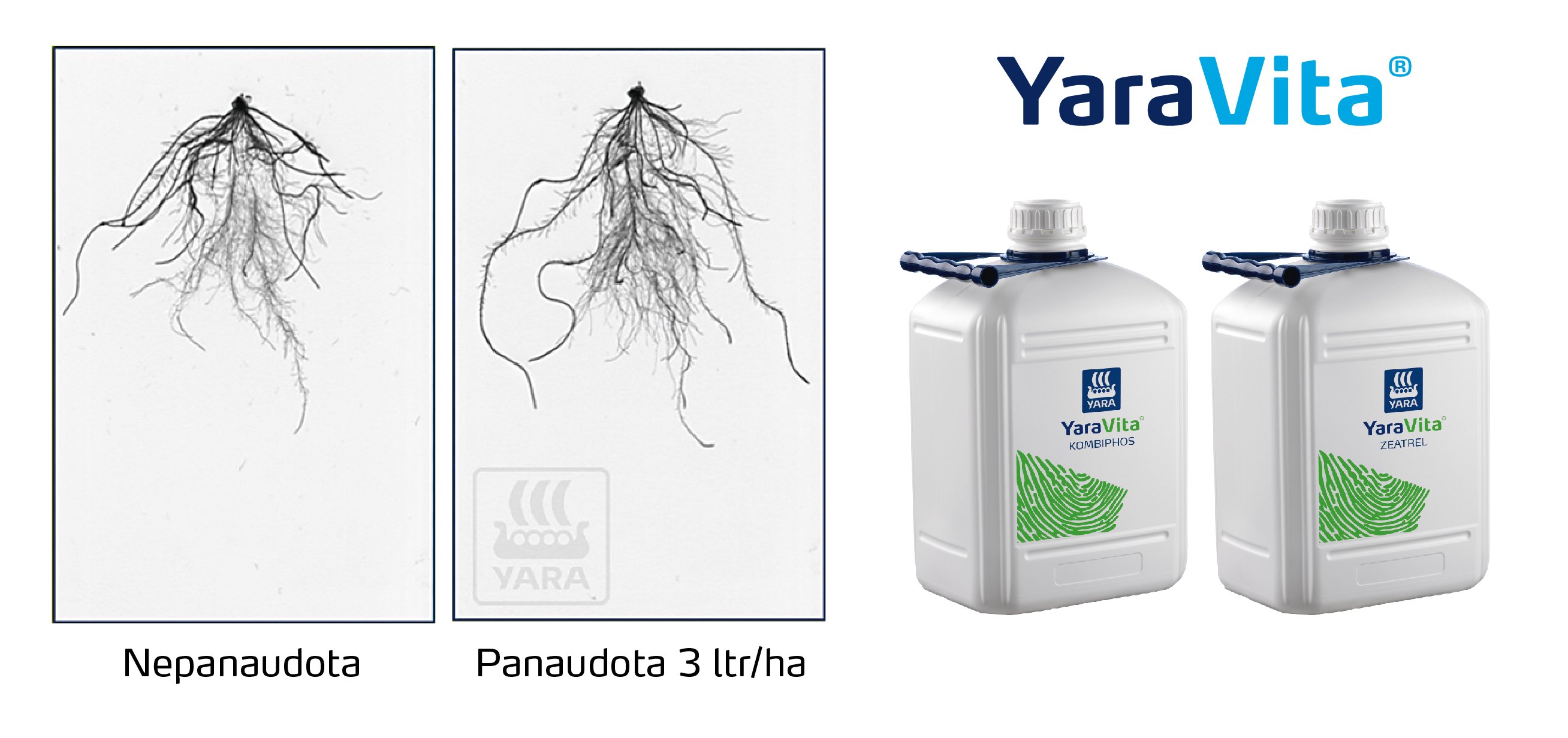 Panaudojus YaraVita KOMBIPHOS arba YaraVita ZEATREL, jau po 14 dienų galima pamatyti javų ir rapsų pasėlių teigiamą vizualinį efektą/pokytį, o išrautų augalų šaknų sistemos masė bus didesnė ir darbingesnė nei tų, kurie nebuvo tręšti minėtomis trąšomis.